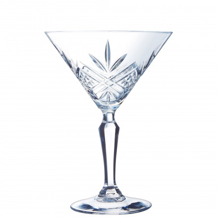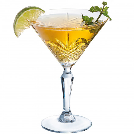 Auch die Cocktailschale „Broadway“ ist mit dem typischen, zeitlosen Design der Serie verziert. Mit dem recht spitz zulaufenden Kelch eignet sich die Cocktailschale auch gut als Martiniglas. Wer von oben in den Kelch hinein blickt, entdeckt ein symmetrisches Muster aus stilisierten Pflanzenblättern. Der Stiel des 15,5cm hohen Glases ist sechseckig und zugleich kurvig geformt. Zum Kelch hin wird der Stiel wieder schmaler und bildet eine Mulde, dank der sich das gut ausbalancierte Glas sicher greifen lässt.